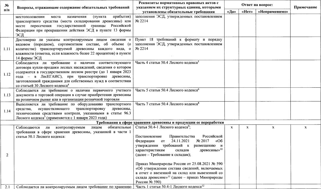 При проведении контрольного мероприятия, инспектор руководствуется «Проверочным листом», содержащим обязательные требования и отметки о их соблюдении или несоблюдении со стороны лесопользователя. Например, необходимо установить: корректно ли собственником древесины вносятся сведения о грузоотправителе в ЭСД, соблюдаются ли требования по размещению складов или достоверно ли указываются сведения о сделке в ГЛР.